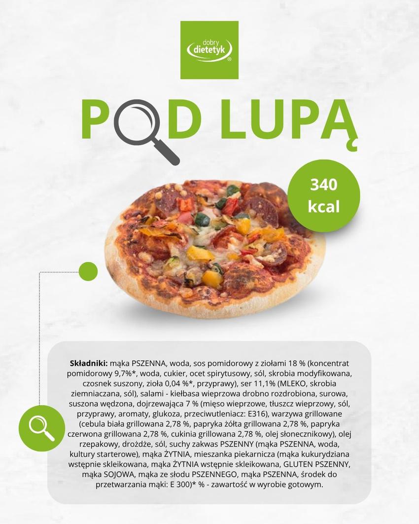 pszenną, wysokoprzetworzoną bazę | sos pomidorowy z cukrem i zagęstnikami | ser zwiększający kaloryczność | salami – przetworzone, tłuste mięso | odrobinę grillowanych warzyw.