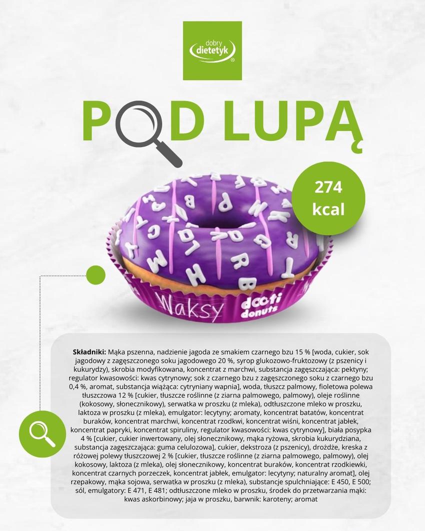 Gdy przyjrzymy się składnikom z bliska… cukier, tłuszcz palmowy, sztuczne barwniki i aromaty. To, co kryje się w tym donucie, to tylko chwilowa przyjemność 🧐