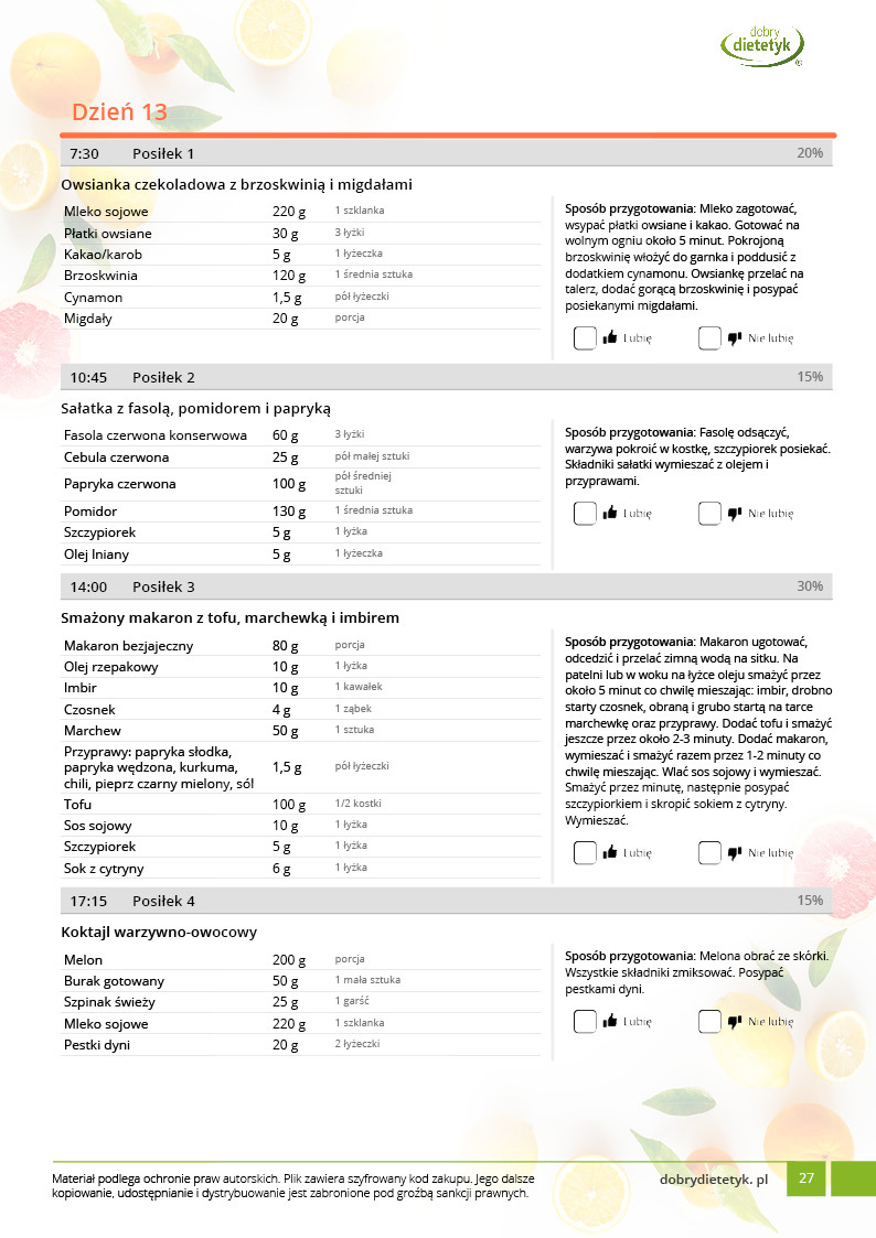 Kompleksowy, 30 dniowy program żywieniowy opracowany specjalnie z myślą o MĘŻCZYZNACH stosujących dietę WEGAŃSKĄ. W jadłospisie wykorzystano produkty wyłącznie pochodzenia roślinnego. Dieta ma charakter oczyszczający, rewitalizujący i wspomagający redukcję zbędnej masy ciała. Posiłki są bardzo różnorodne i urozmaicone, a jednocześnie dostarczają wszystkich składników odżywczych niezbędnych do prawidłowego funkcjonowania organizmu. W komponowaniu jadłospisu szczególny nacisk położono na zawartość białka, żelaza, wapnia oraz witamin z grupy B. Dodatkowo posiłki są ciekawe, niezwykle smaczne, a przy tym łatwe w przygotowaniu. Dzięki temu dieta sprawdzi się zarówno u tych kobiet, które stosują dietę roślinną już od jakiegoś czasu i szukają nowych kuchennych inspiracji, jak i u tych, które dopiero zaczynają swoją przygodę z weganizmem.