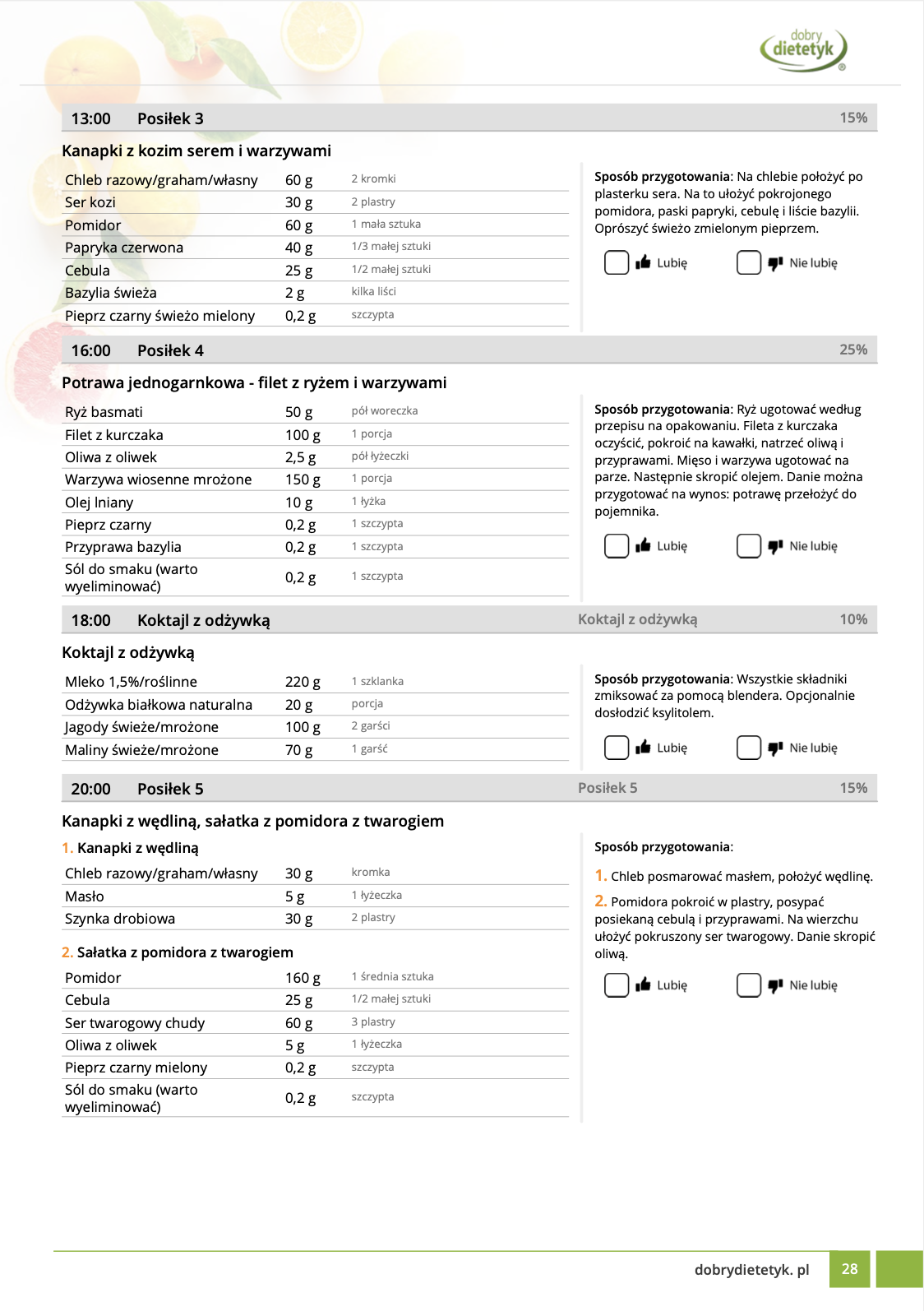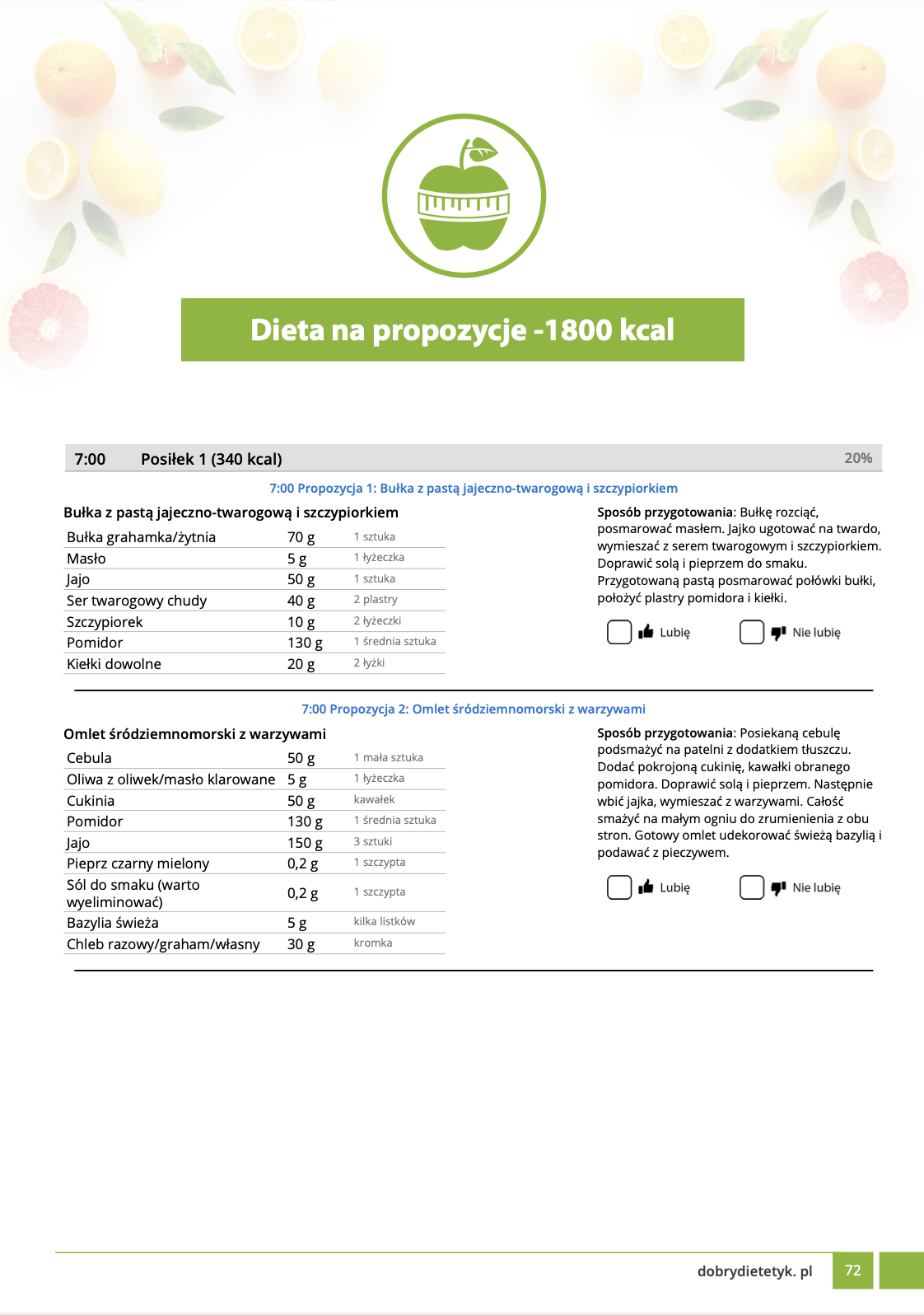 w formie propozycji posiłków (zamiast pojedynczych jadłospisów jednodniowych, przygotowano propozycje kilku propozycji dań na każdy posiłek). Tutaj nie uzależniamy Cię od tego jakie masz np. w danym dniu zjeść śniadanie czy obiad, tylko sam wybierasz sobie ulubione danie z kilku przedstawionych przez nas propozycji.