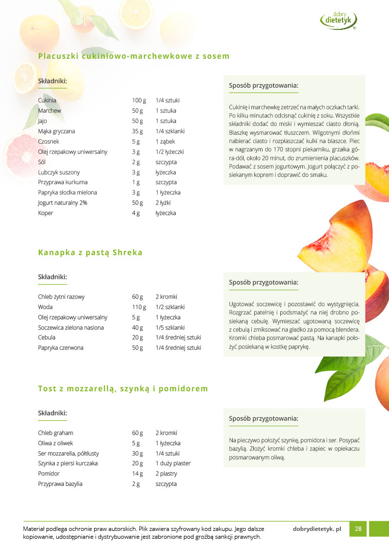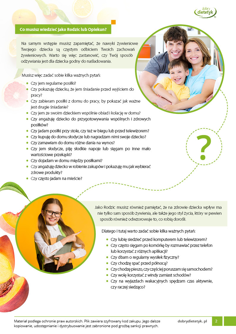 Specjalny Przewodnik Żywieniowy dla rodziców zainteresowanym poprawą żywienia wśród swoich dzieci. Poradnik zawiera zbiór zasad jakimi powinien kierować się rodzic w trosce o zdrowie swojego dziecka. Jednocześnie opracowanie zawiera plan żywienia z przykładami urozmaiconych i zdrowych dań na I i II śniadanie, obiad, podwieczorek i kolację. Każdy posiłek jest dokładnie opisany, zawiera spis produktów z podaniem ich wagi oraz szczegółowy przepis jego przygotowania.